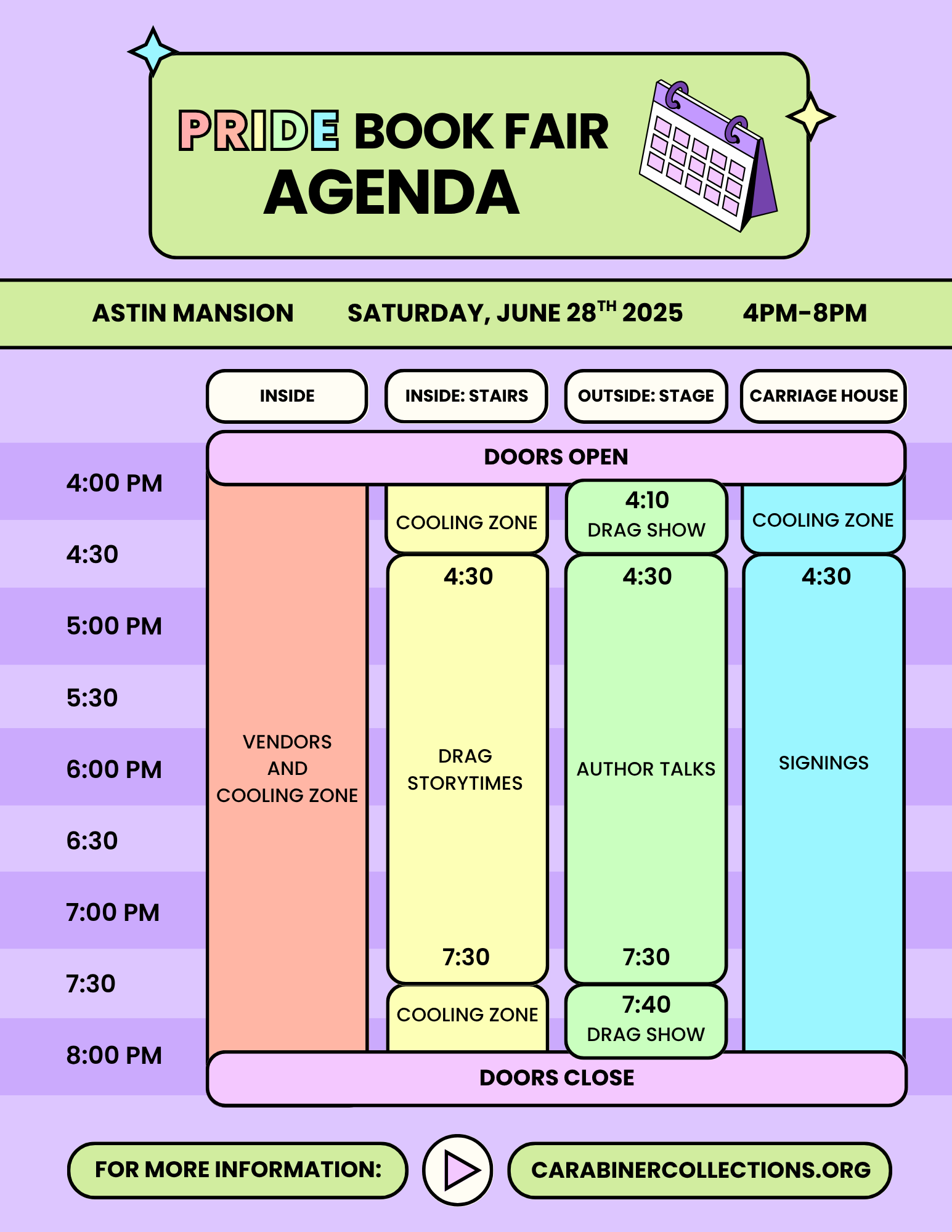 We’re excited to host the Pride Book Fair, celebrating queer stories and voices! This free event will feature entirely LGBTQIA+ books, author readings/signings, drag performances, community resources, and vendors. It’s a space for connection, affirmation, and resistance against the censorship of banned books.